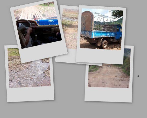 到县城后没有班车,只能租一辆农用车继续前行,道路崎岖难行,还有几座小桥: