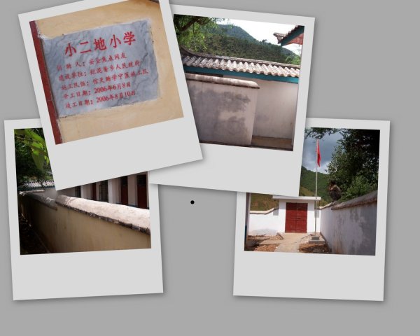 大概再走一个半小时,抵达群山包围中的小二地,远处望去,群山掩映的地方有所白房子,那就是我们此行的目标小二地小学,至少是砖瓦房: